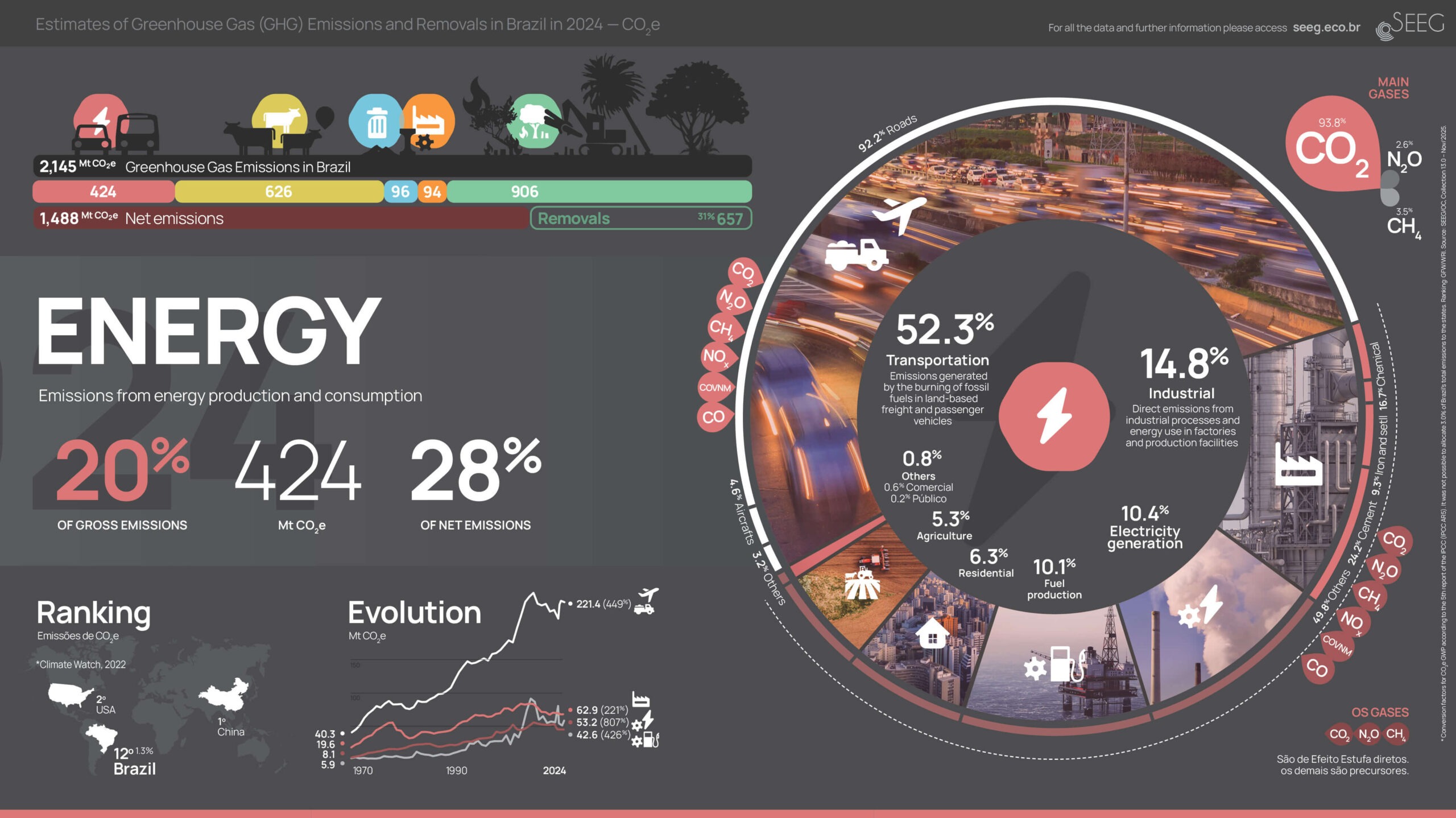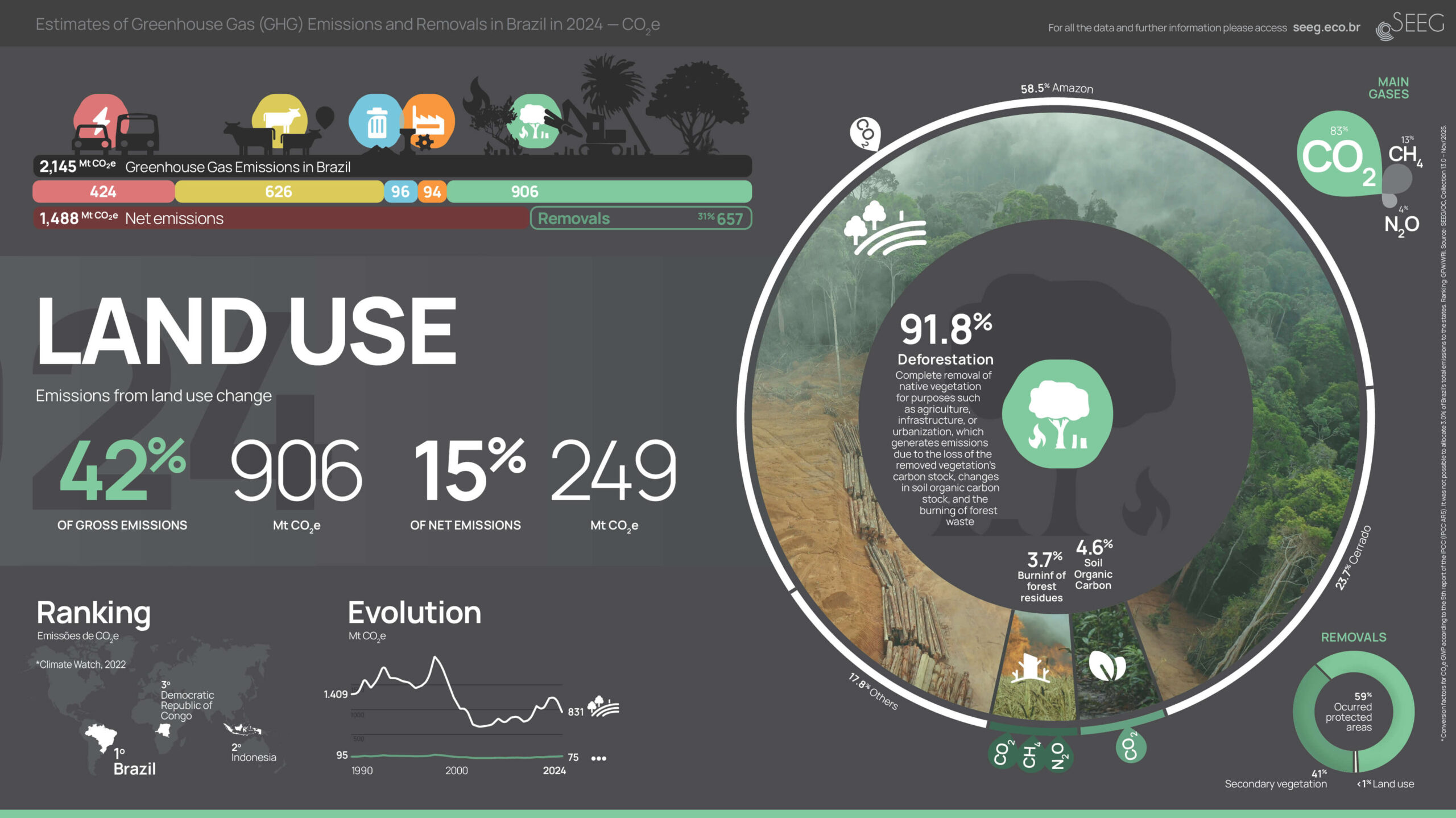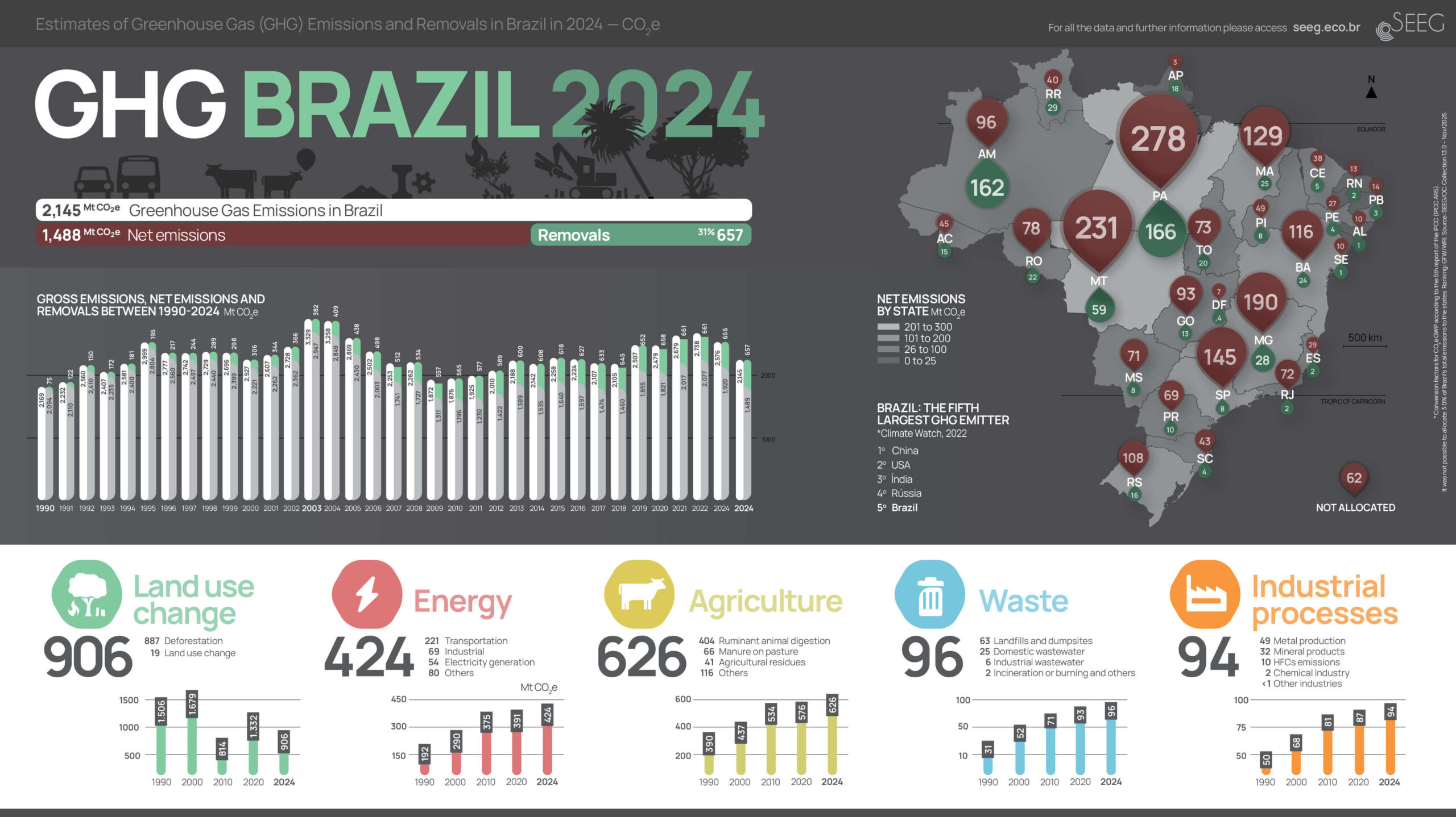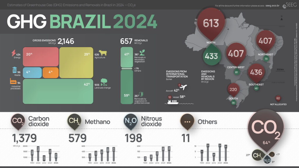 The following visualizations provide two general perspectives on national greenhouse gas emissions in the last year. One includes total emissions by sectors, as well as removals, gases, bunker emissions (international transport), and Brazilian regions. The other shows historical totals since 1990, emissions and removals at the state and sectoral levels. In the 5 sectoral infographics, we demonstrate the overall panorama of each sector as well as the detailed historical evolution, distribution in emitting sources, various gases, and country rankings. Click on the images to view in full screen and download.