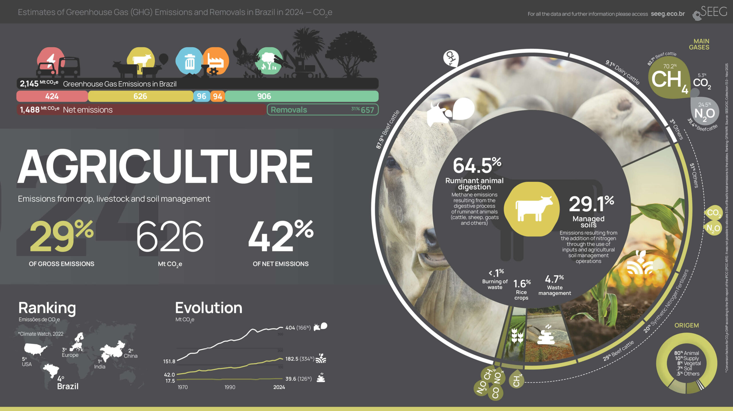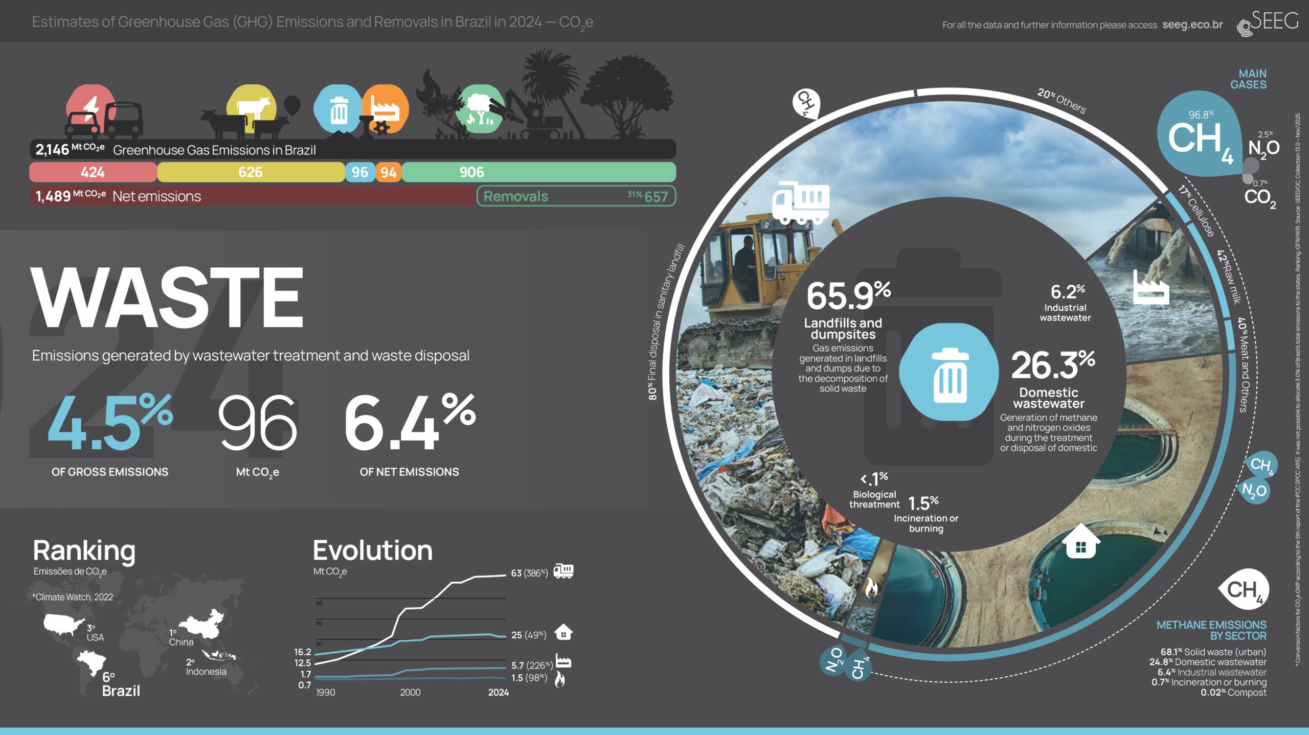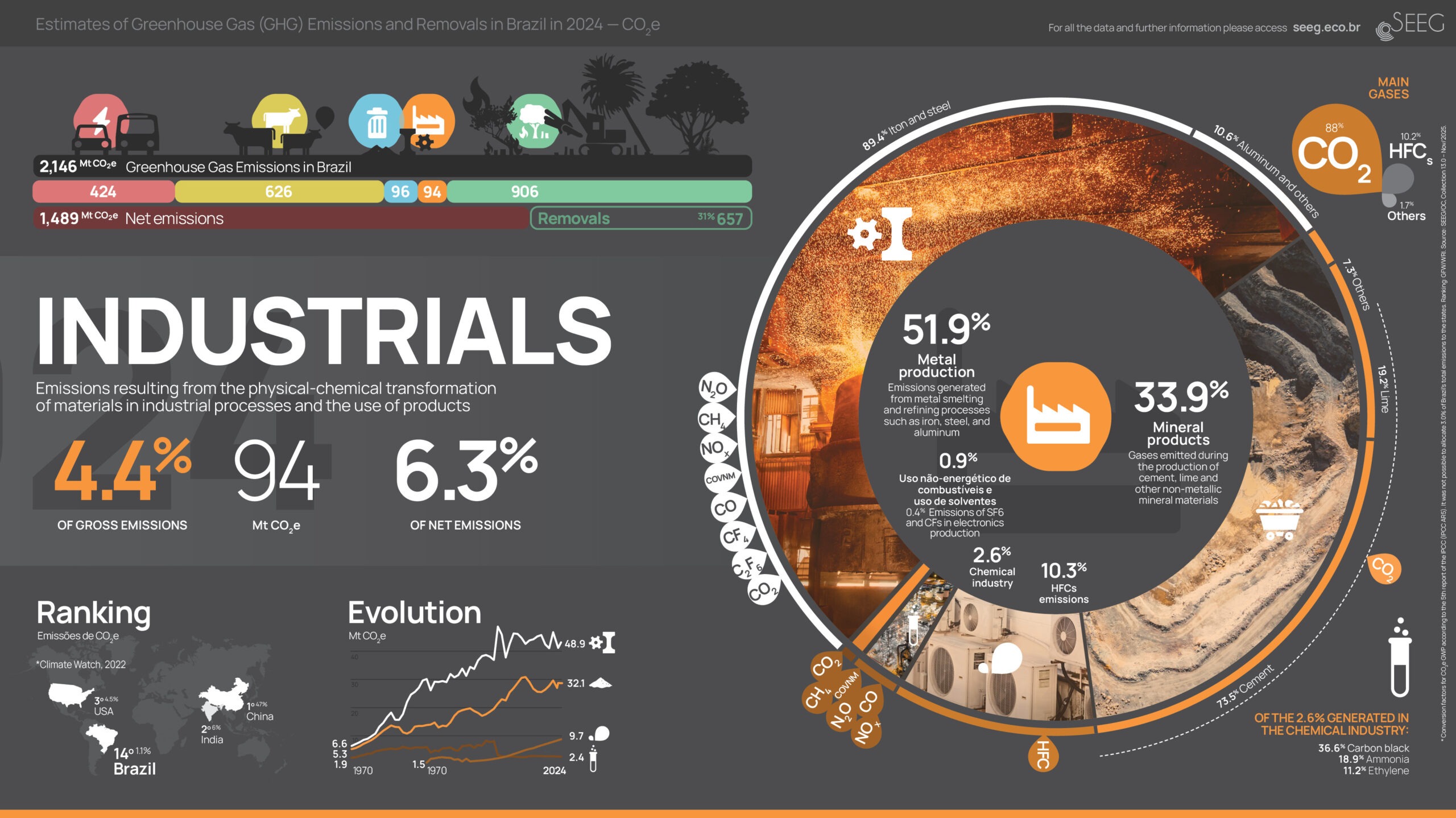 The following visualizations provide two general perspectives on national greenhouse gas emissions in the last year. One includes total emissions by sectors, as well as removals, gases, bunker emissions (international transport), and Brazilian regions. The other shows historical totals since 1990, emissions and removals at the state and sectoral levels. In the 5 sectoral infographics, we demonstrate the overall panorama of each sector as well as the detailed historical evolution, distribution in emitting sources, various gases, and country rankings. Click on the images to view in full screen and download.